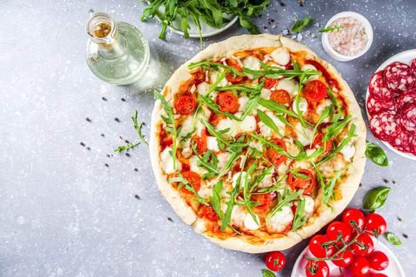 Sos de roșii, mozzarella, sunca, salam , bacon, carnati
