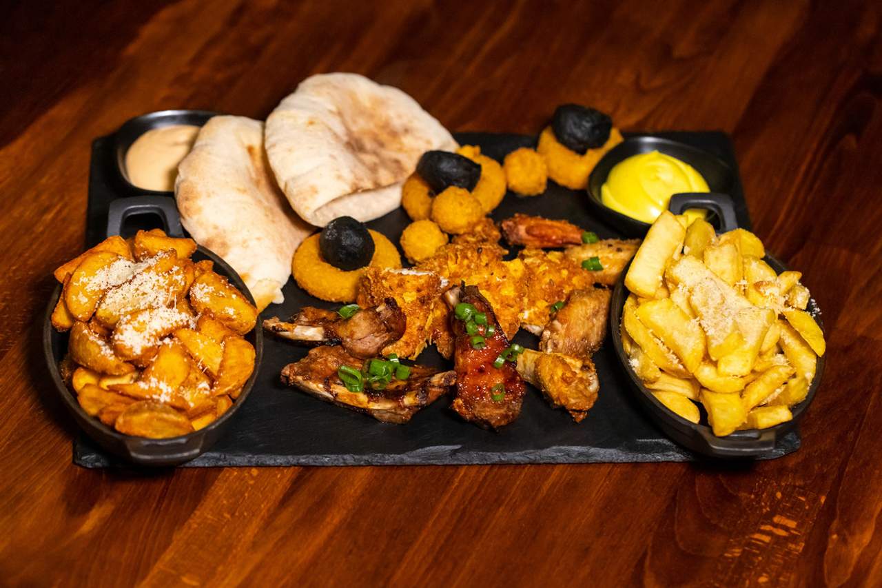 Crispy, aripioare, coaste, frigarui cu pui, turtă, cartofi prăjiți steakhouse și wedges (850g)