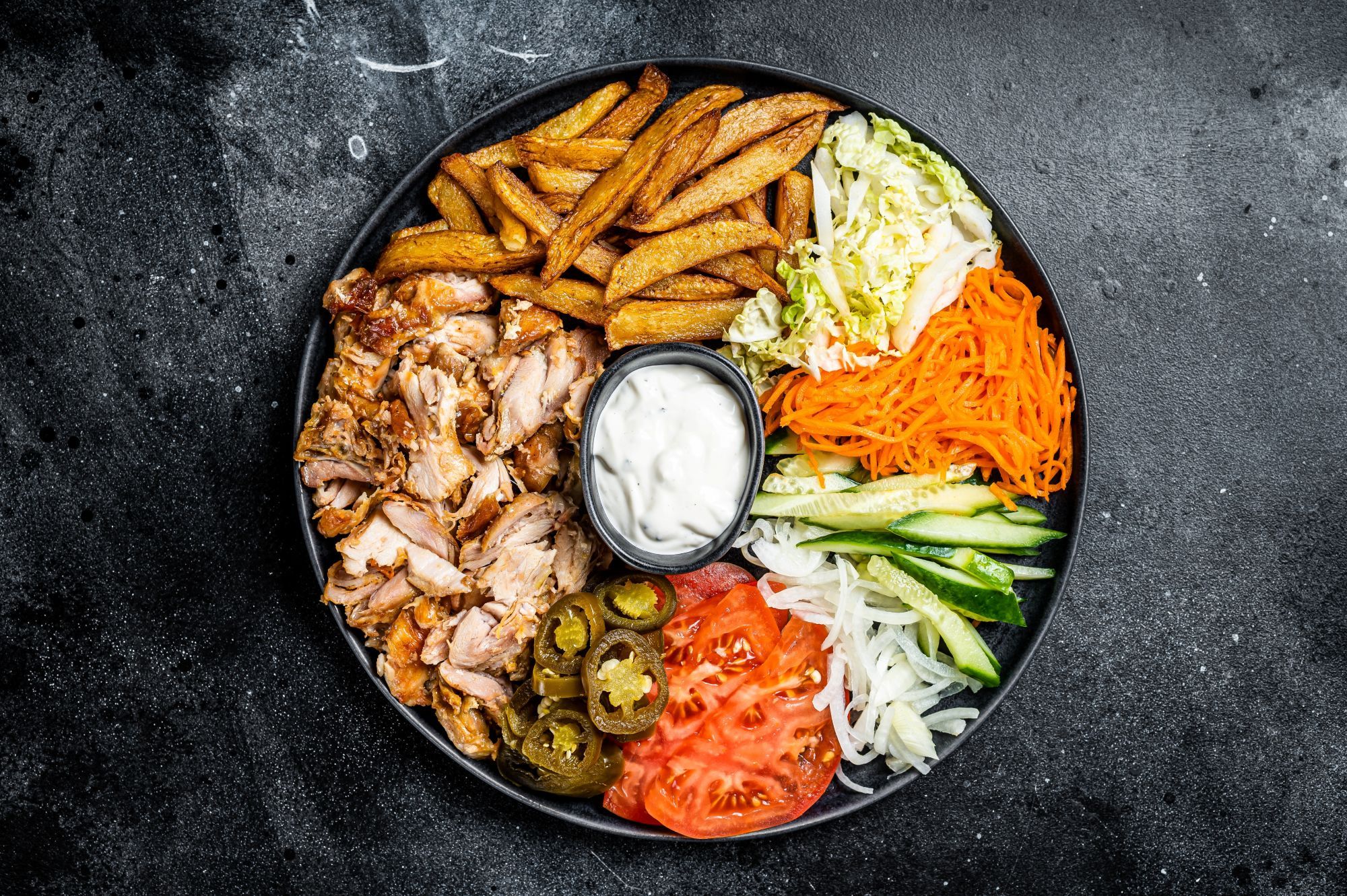 Lipie homemade, carne pui, cartofi, ceapa, castraveti murati, rosii, varza, sos maioneza cu usturoi, sos curry si masline, sos tartar, sos picant Pasha - 550g