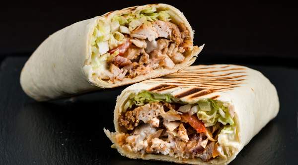 Pui, cartofi pai, roșii, varză, ceapă, castraveți murați, sos maioneză, sos usturoi, sos king special, salată de varză - 500g