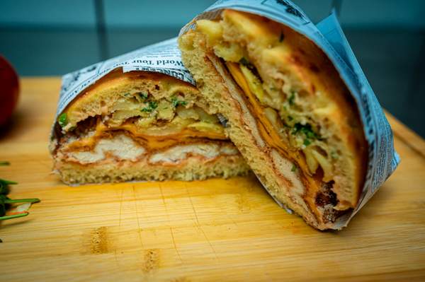 FOCACCIA , SNITEL DE PUI , SALATA COLESLAW , CHEDDAR , CASTRAVETI MURATI , SOSUL CASEI , ROSIE , CEAPA ROSIE , BACON - 475g