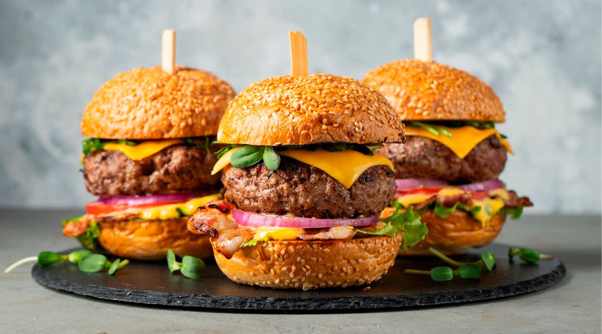 Juneći burger, burger sos, čedar, zelena salata, luk, paradajz, pomfrit, pohovani sir