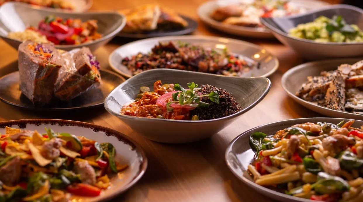 Piletina, zelena salata, feta sir, sušeni paradajz, cherry paradajz, susam, dressing