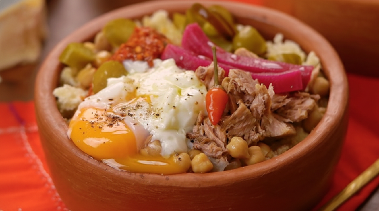 Salade tunisienne, salade mechouia, oignon frais, piment vert frit, piment rouge , bar abid, olive, câpres, pomme de terre, œuf frit, huile d'olive, thon