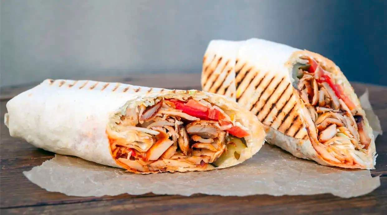 Арабський лаваш, квашені огірки, свіжі помідори,зелень (петрушка),соковите мʼясо куряче з вертела, сир сулугуні, авторський соус без майонезу ( часниковий або пікантний)