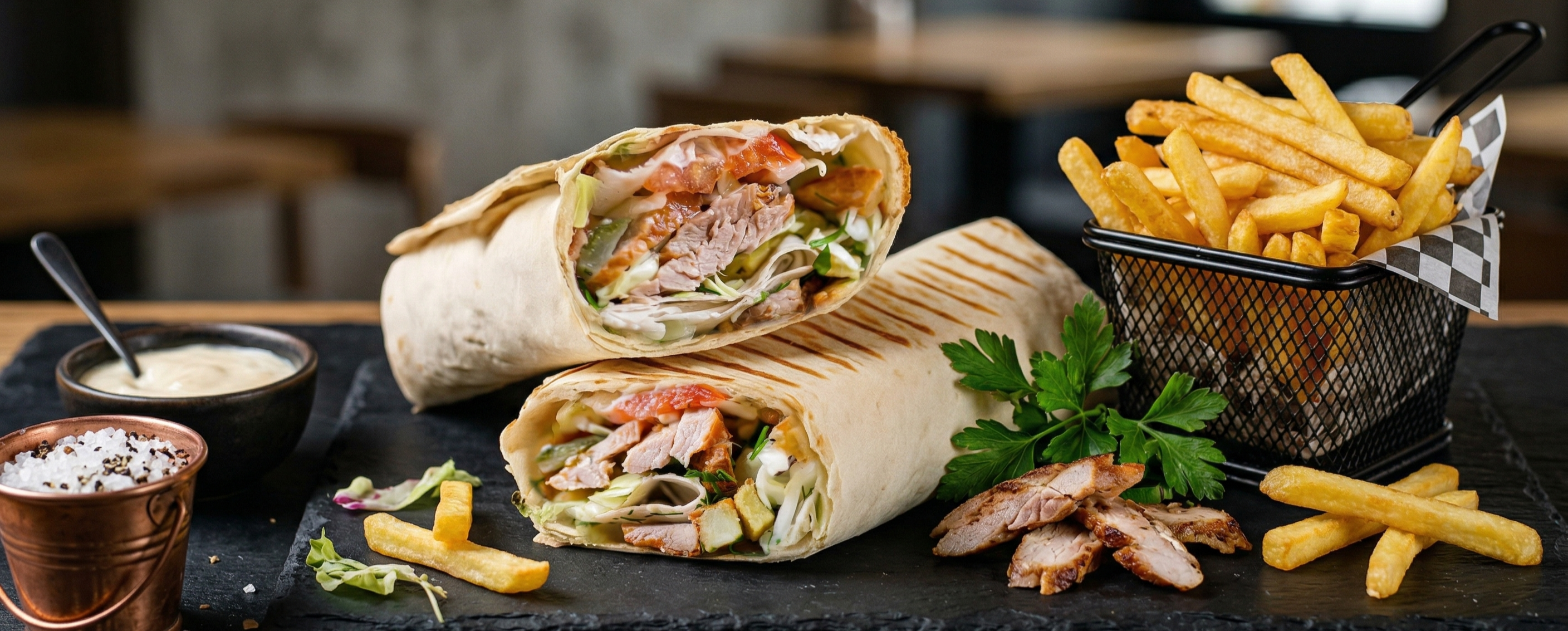 Хрусткий лаваш, помідор, салат Айсберг, м'ясо на вибір, цибуля, соус на вибір.