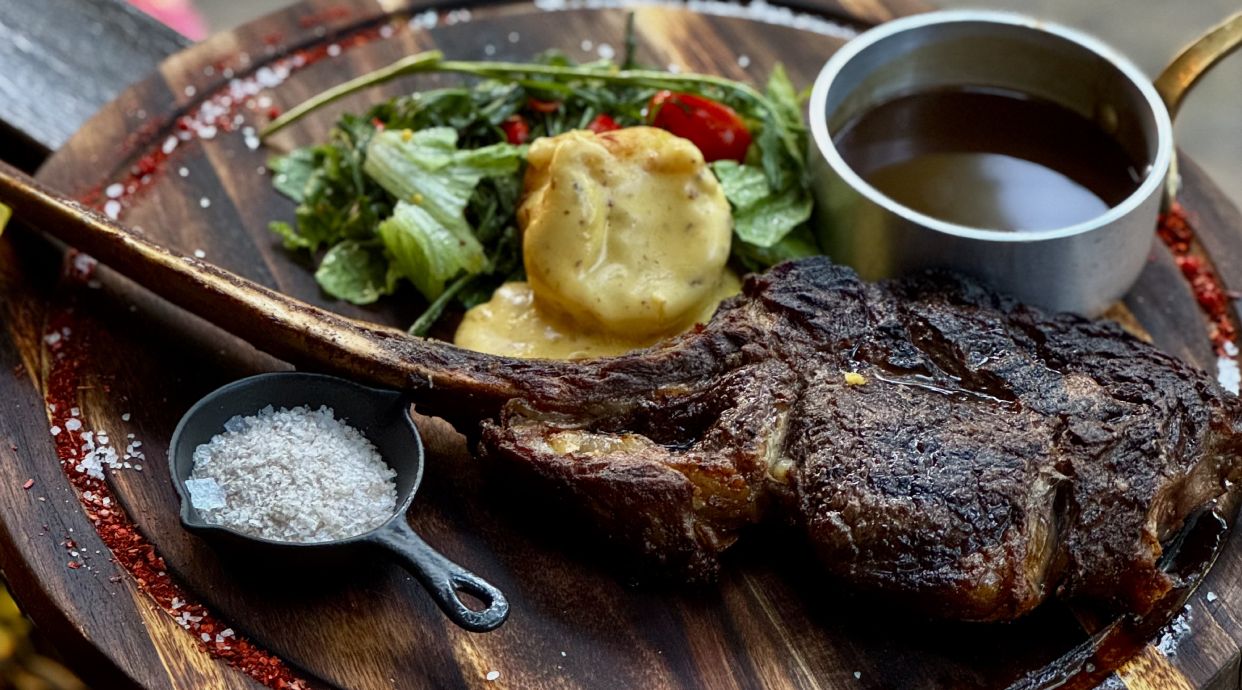 Стейк стріплоін з ікрою з грільованих овочів, яєчнею та хрусткими грінками.