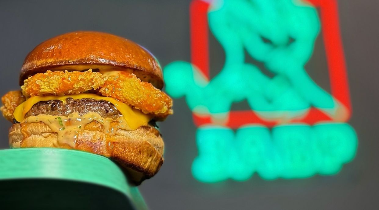 Булочка бріош, яловича котлета, сир чеддер, кріспі цибуля, соус айолі, сирний соус, халапеньо, бекон.