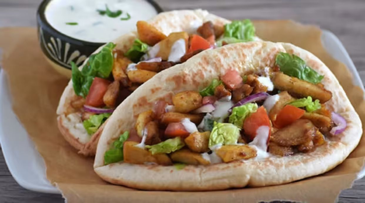 Курка , огірок солоний ,цибуля Марс маринована , сир фета , соус часниковий , помидор, зелень , соус томатний ,соус гострий