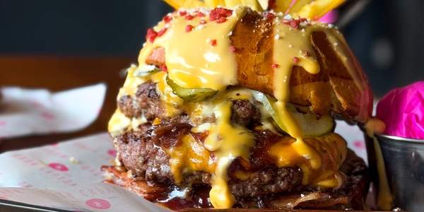 Булочка бріош, яловича котлета, сир чеддер, карамелізована цибуля марс, бекон, соус айолі, сирний соус, посипаю сиром пармезаном, швиденько окутуй свого Подаю з салатом коул слоу та сирною ванною
