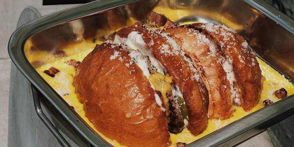 Фірмова булочка, котлета з яловичини, огірок маринований, бекон, соус айолі, пармезан. Подається в сирній ванній.