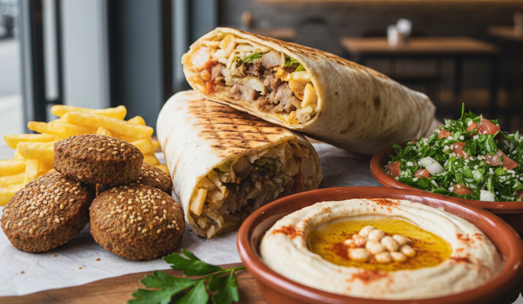Лаваш, курячк м'ясо, гиби печериці з цибулею тушені, морква по-корейськи, картопля фрі, пекінська капуста, огірки, соус сацебелі, часниковий соус