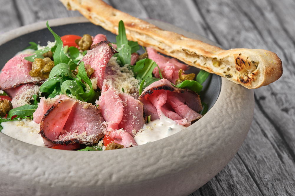 Рукола, телячий ростбіф, соус тоннато, смажені каперси, томати чері, пармезан, грісіні власного приготування.