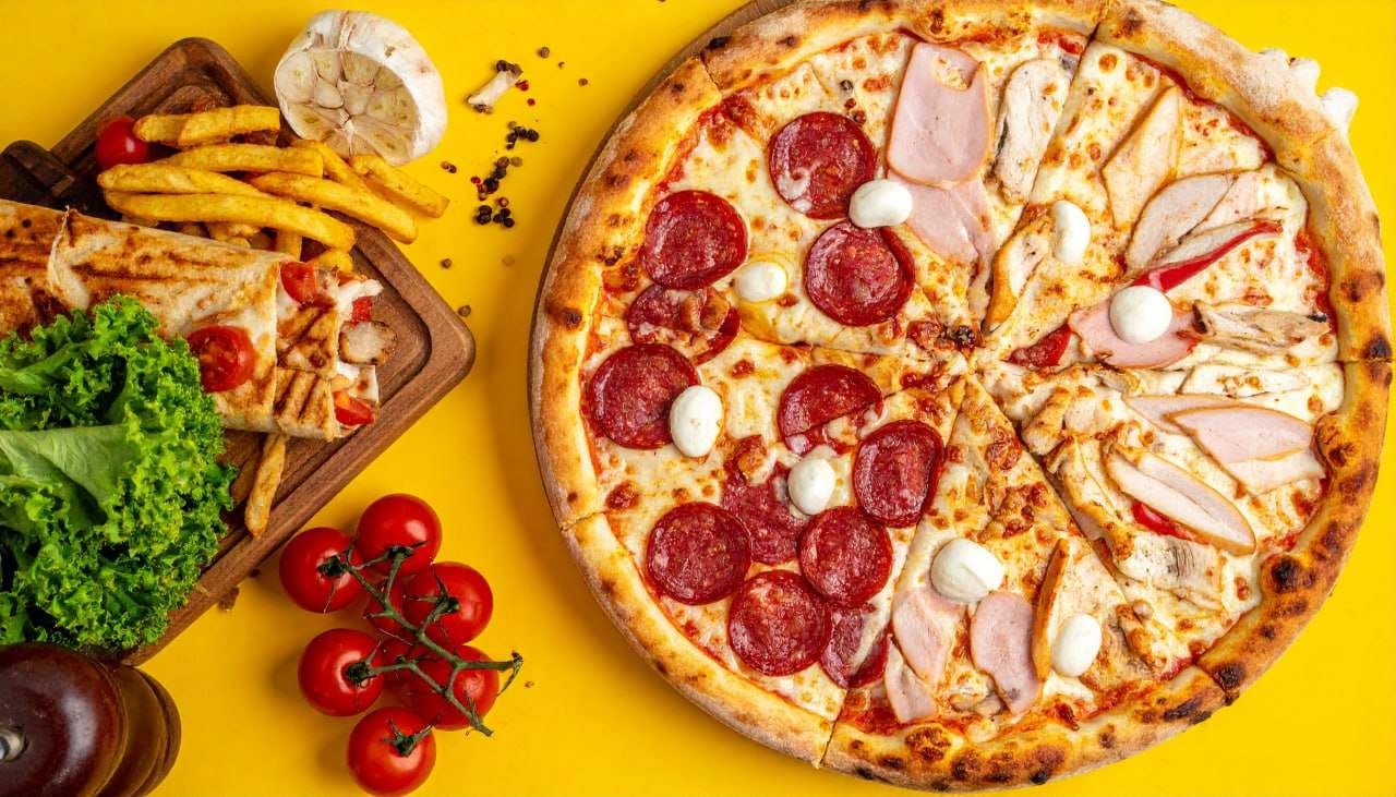 Дріжджове тісто, соус томатний, шинка, курка, салямі, сир, кукурудза