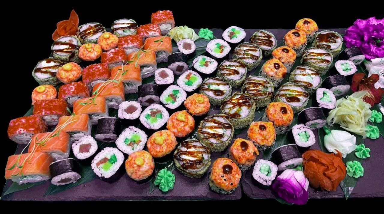 72 կտոր ֆիլադելֆիա, կալիֆորնիա, թարմություն, մակի վարունգ, մակի թունա, թխված սաղմոն, օձաձուկ, իոկոգամմա, ֆուձիյամա)։