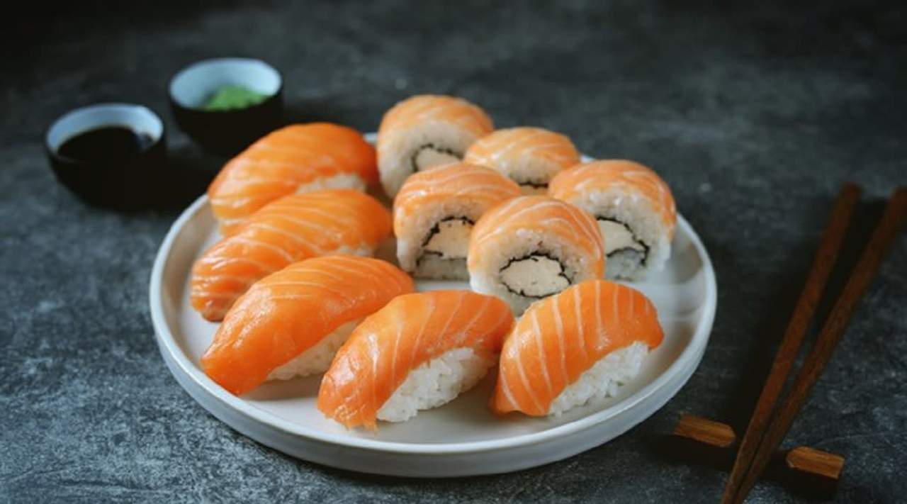 Ориз, нори, пущена сьомга, прясна сьомга, тон, темпура, тобико, сусам, кимчи сос