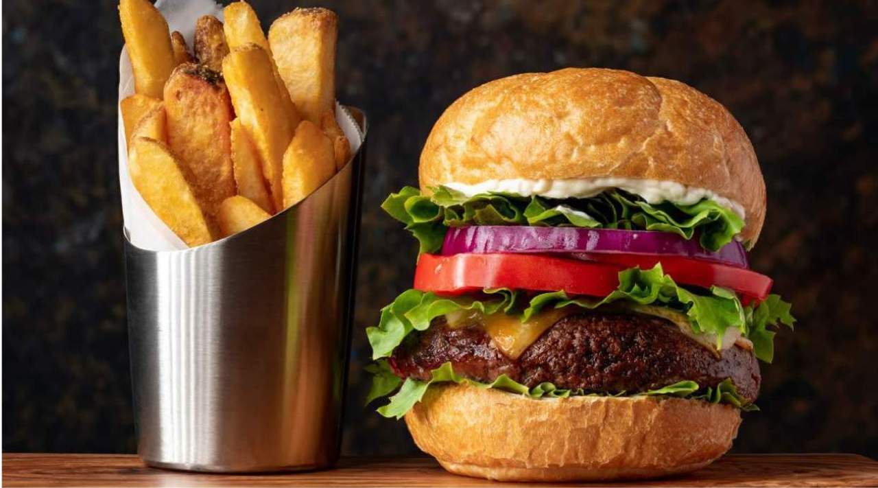 телешки бургер, бекон, чедър, маруля, лук домат, кисели краставички, яйце, BBQ сос, картофки 1 бр