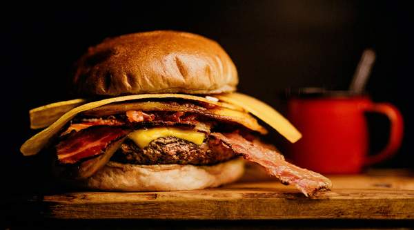 Истинската класика – сочен телешки бургер с разтопен чедър и ементал, свежи зеленчуци и барбекю сос, поднесен с хрупкави картофки.