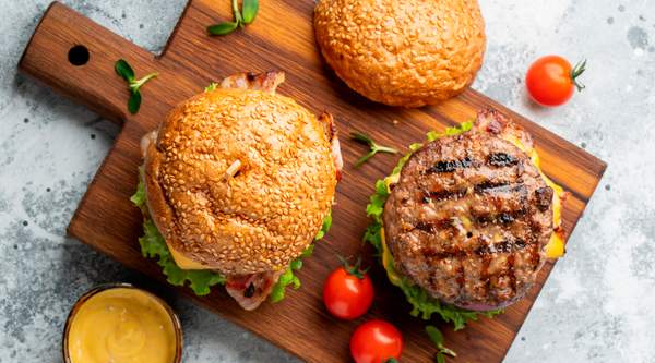 Свинско месо, пушен бекон, чедър, яйде, паниран лук, рукола, свежа салата, домат, майонеза, картофки
