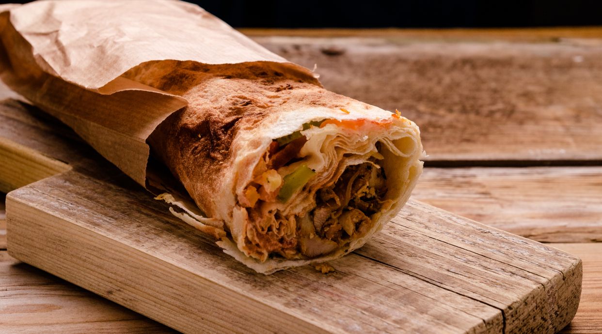 Чий кюфте в лаваш със салата айсберг,кисели краставички, магданоз, рукола,сок от лимон и сос от нар.