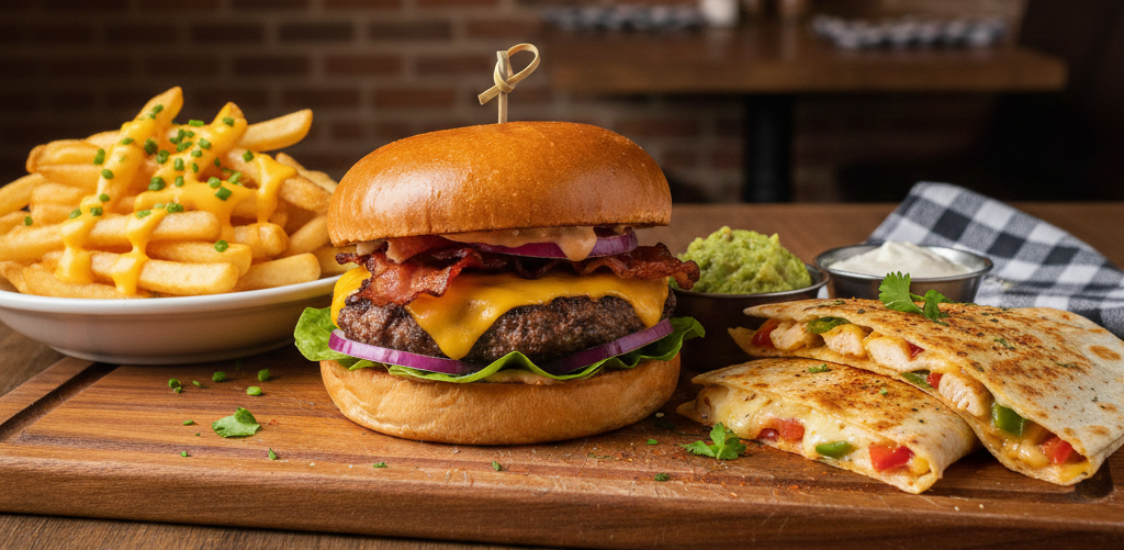 Двоен телешки бургер с хрупкав бекон, чедър, свежи зеленчуци и домашен бургер сос, поднесен с картофки. Ultimate munchies бургер - 380г