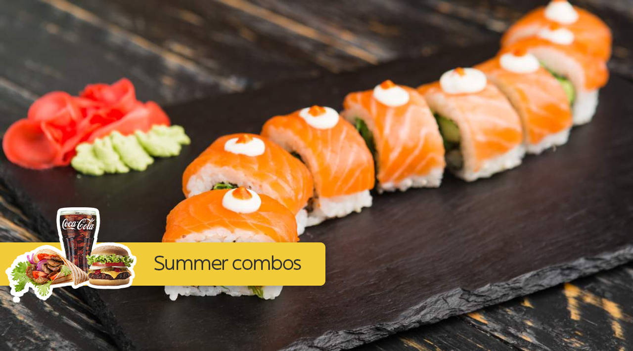 Фуромаки сьомга и краставица 6бр, хосомаки сьомга 8бр, урамаки филаделфия сьомга 4бр, калифорния сьомга 4бр, нигири сьомга 2 бр, нигири сьомга татаки 2бр, уасаби, джинджифил, соев сос