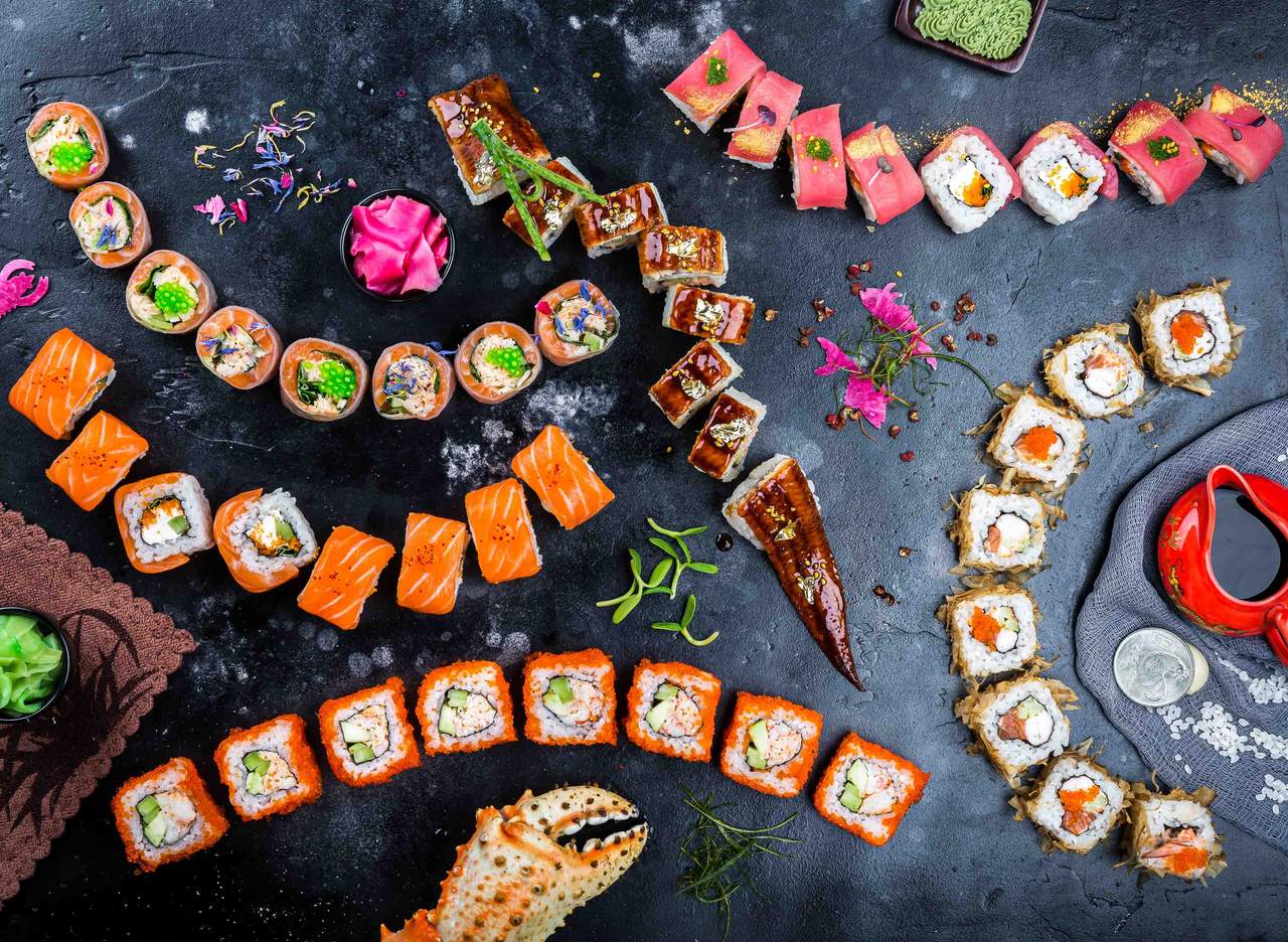 (12бр) футомаки пикантна сьомга, пикантен краб(8бр) райс рол - пушена сьомга, филаделфия,авокадо, краставица, (8бр) урамаки - краб краставица сусам, (16бр) хосомаки, (4бр) урамаки калифорния скарида, (4бр) нигири, (4бр) гункан