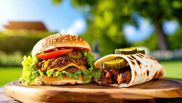 Пилешко месо, чедър , доамт, краставички пържени картофи (пресни)