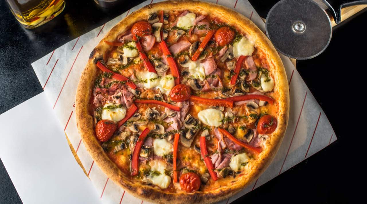Доматен сос, кашкавал, шунка, царевица, мариновани маслини, риган