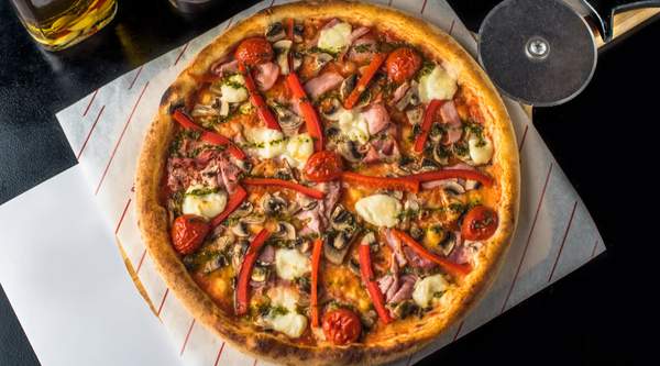 Доматен сос, кашкавал, бекон, шунка, пушено пиле, варено яйце, гъби, риган