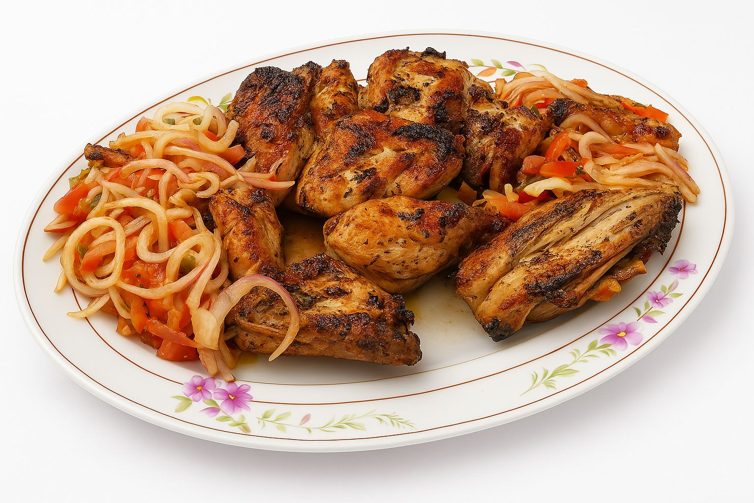 Plat de poulet épicé préparé avec des oignons marinés