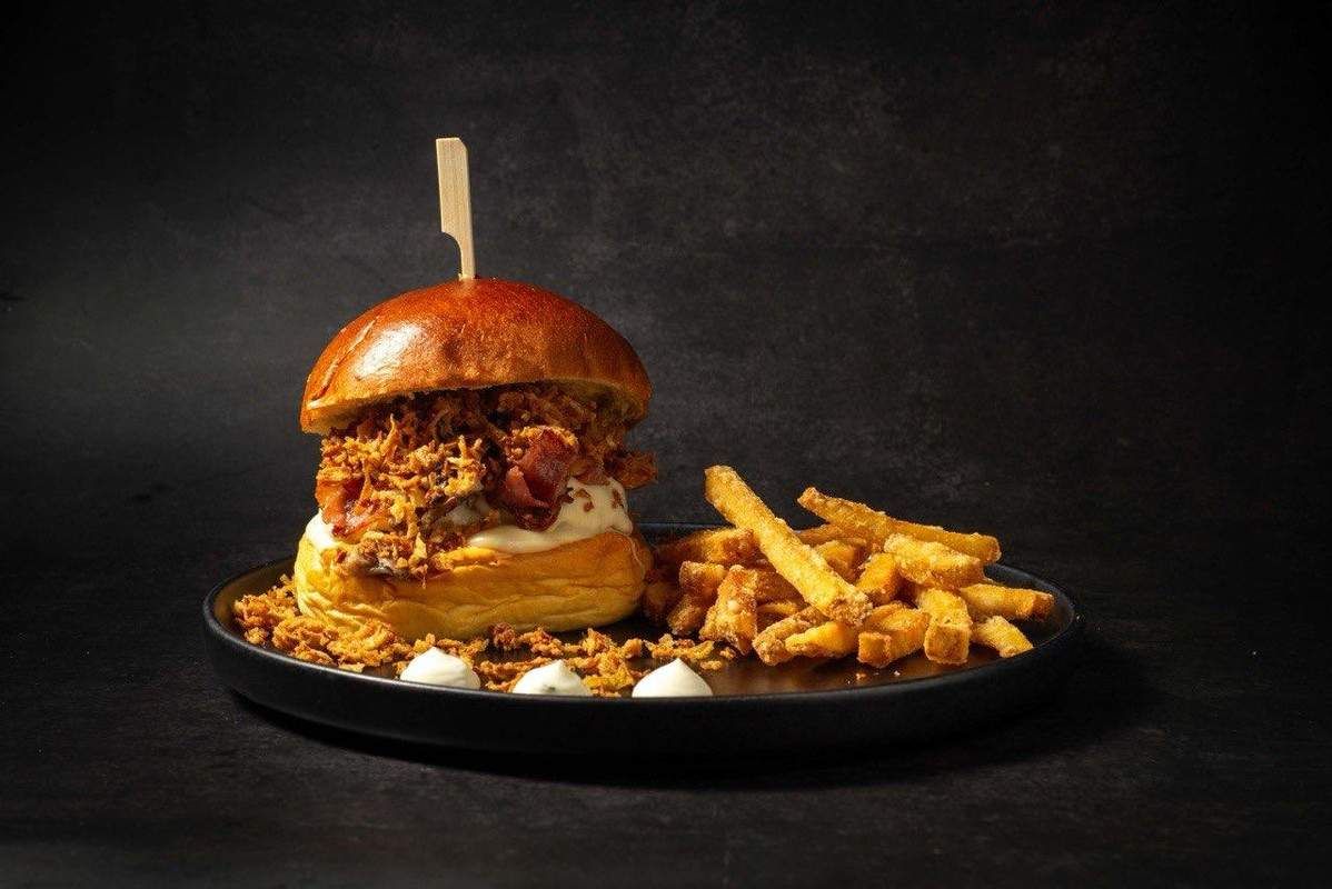 Carne de ternera, queso cheddar, pulled pork, queso Gouda, salsa ahumada y cebolla crujiente