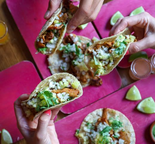 Estos tacos característicos de la región del Yucatán los va a enamorar. La carne de cerdo la adobamos por 12 horas en achiote y naranja y luego la servimos con el tradicional topping de Xnipek. Ponle la cebolla morada que mandamos.