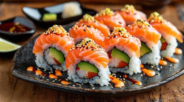 Uramaki relleno de salmón marinado, queso crema y aguacate