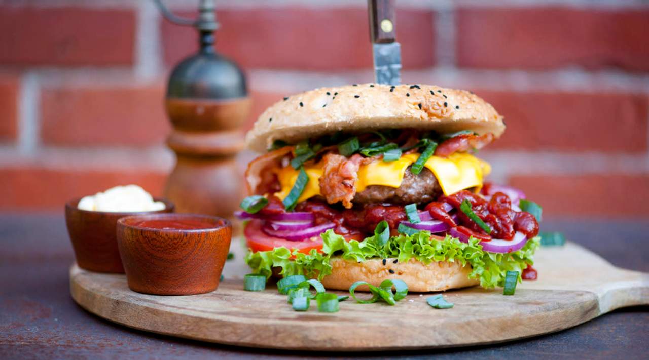 Carne de cerdo (220 Gr.), lechuga, tomate, cebolla pochada, bacón crujiente y queso fundido.