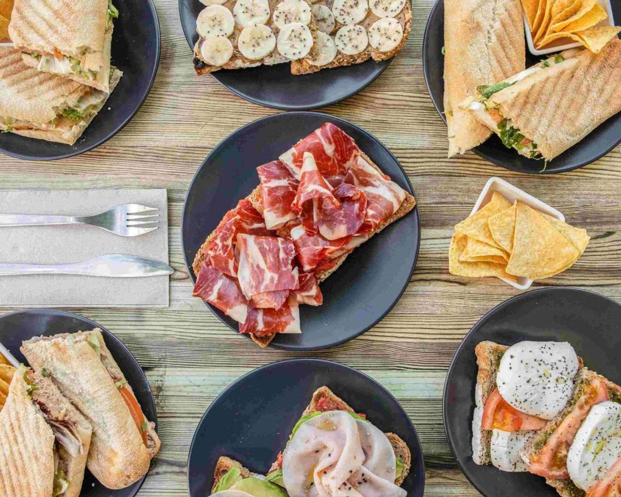 Pan cristalino, roast beef, rúcula, cebolla morada, miel y mostaza