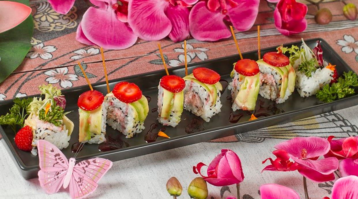Mini rollo tempura con salmón, Philadelphia y fresas