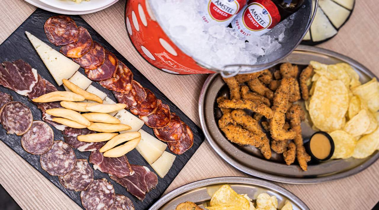 Campero de lomo al ajillo, paleta ibérica de cebo, tomate y pimiento verde, acompañado de patatas bastón