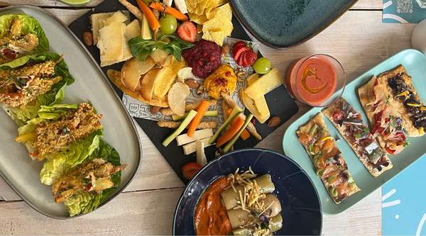 chapata con alioli vegano, pollo vegetal asado, pepinillos, mostaza, veganyork y mozarella OPCIÓN VEGANA