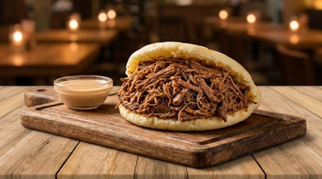 Arepa Asadas,Rellena con carne mechada y abundante queso amarillo rallado.