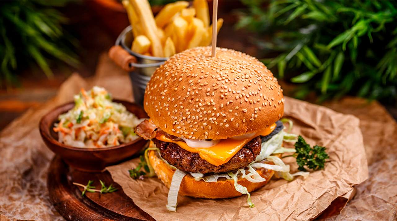 Cebolla caramelizada, doble vaca madura (280 g.), doble de cheddar, bacon, hoja de roble, tomate y salsa calvin