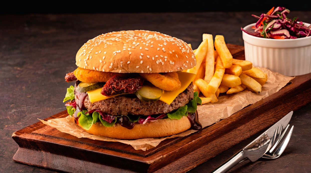 Patty de carne de ternera fresca (100 g.) (1 ud.), queso cheddar, tomate, cebolla, lechuga, salsa y pepinillos en vinagre