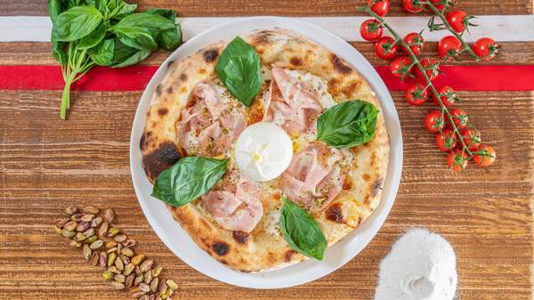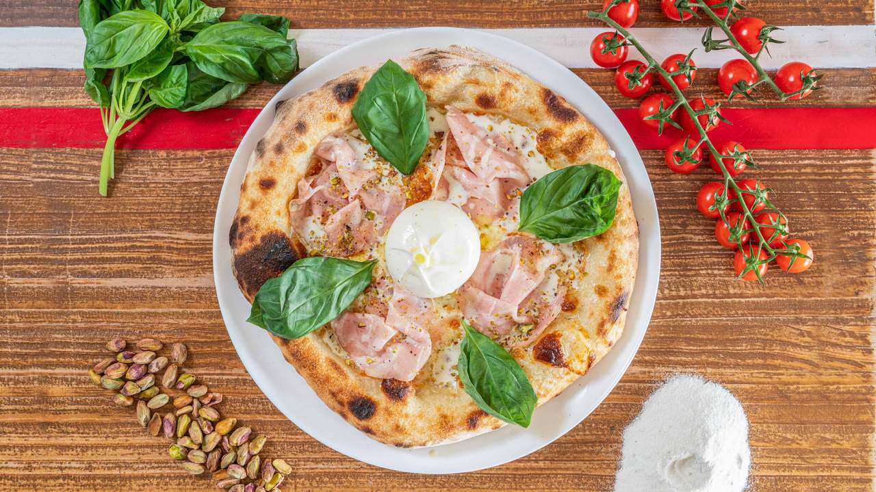 Mozzarella D.O.P. Italia, crema 4 quesos, mortadela I.G.P. Bologna, pistacho y burrata