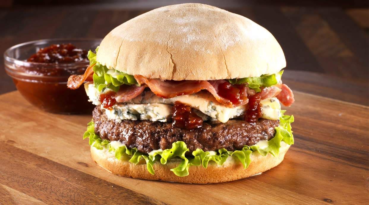 Hamburguesa de buey, salsa rosa, cebolla caramelizada, mezclum y queso rúlo de cabra