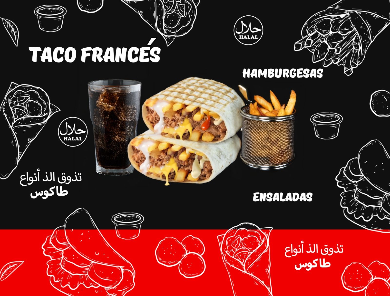 Taco relleno de carne picada halal, papas fritas, salsa de yogur, salsa de queso y salsa roja