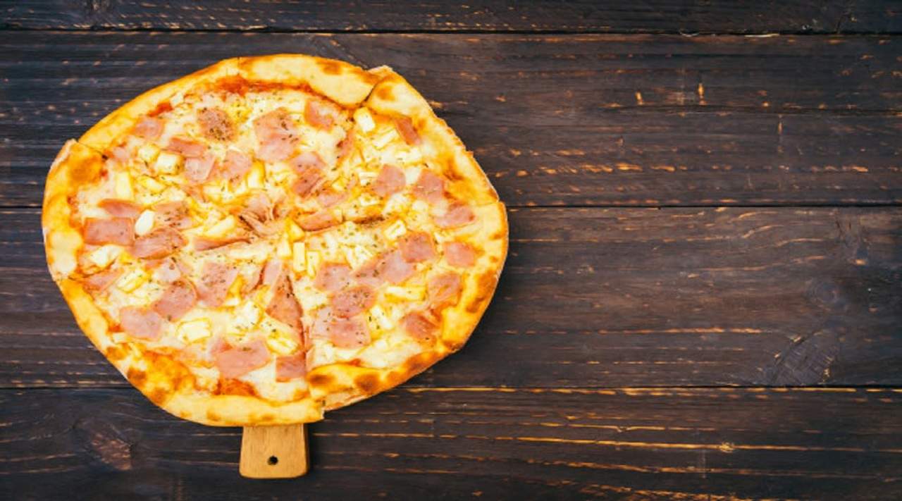 Base de pizza, salsa de tomate, mozzarella 100%, jamón dulce y piña