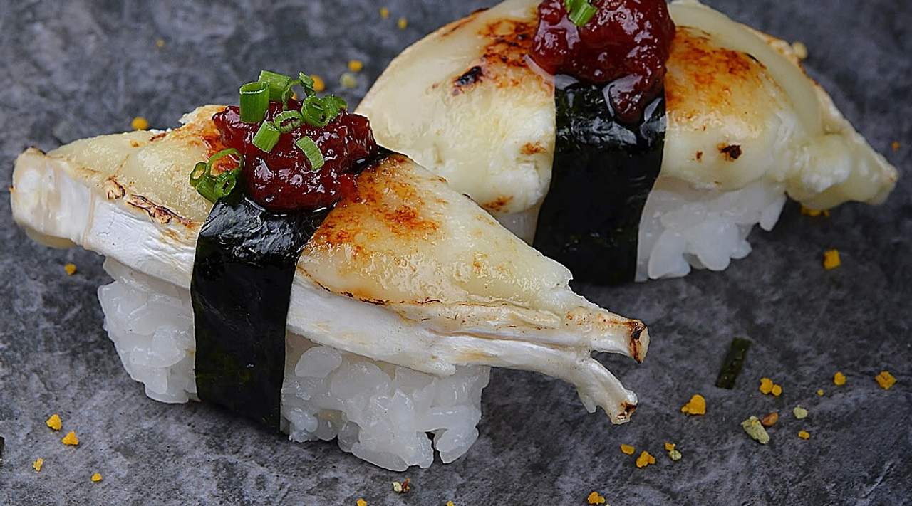 Hosomaki de mayor tamaño relleno de tartar de atún y salmón picante, canónigos, aguacate, queso de cabra, cebolla caramelizada, chutney de tomate y sésamo blanco. **Alérgenos: Gluten, pescado, lácteos, sésamo