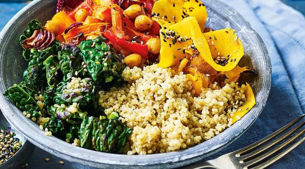 Quinoa, fideo de zanahoria, brócoli, espinacas, tomate cherry, heura, aliño vegano.