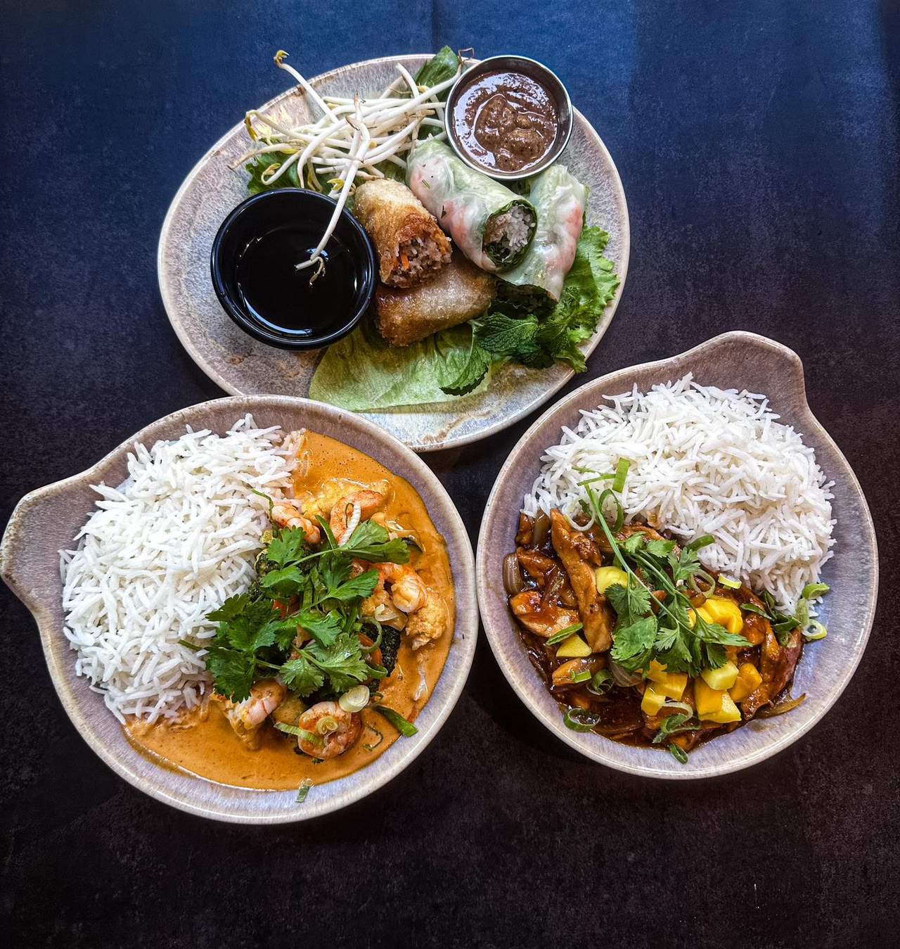 Rollitos frescos de papel de arroz, rellenos de tofu, pepino, zanahoria, lechuga, fideos de arroz, anacardos, menta, cilantro y albahaca servidos con salsa de anacardo (no se pueden quitar ingredientes)