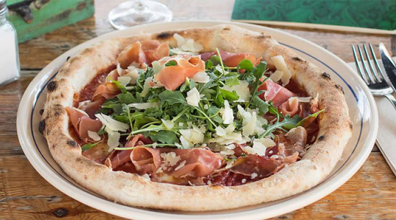 Fiordilatte, scamorza, rúcula selvática, speck, tomate fresco “datterino siciliano” y aceite OVE.
